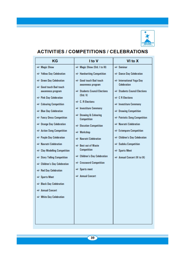 Along with the various activities and competitions held in the school, projects, group discussions, field trips, picnics, intra and inter school competitions and long distance tours are organised to develop various aspects in the child and to have all round developments within them.